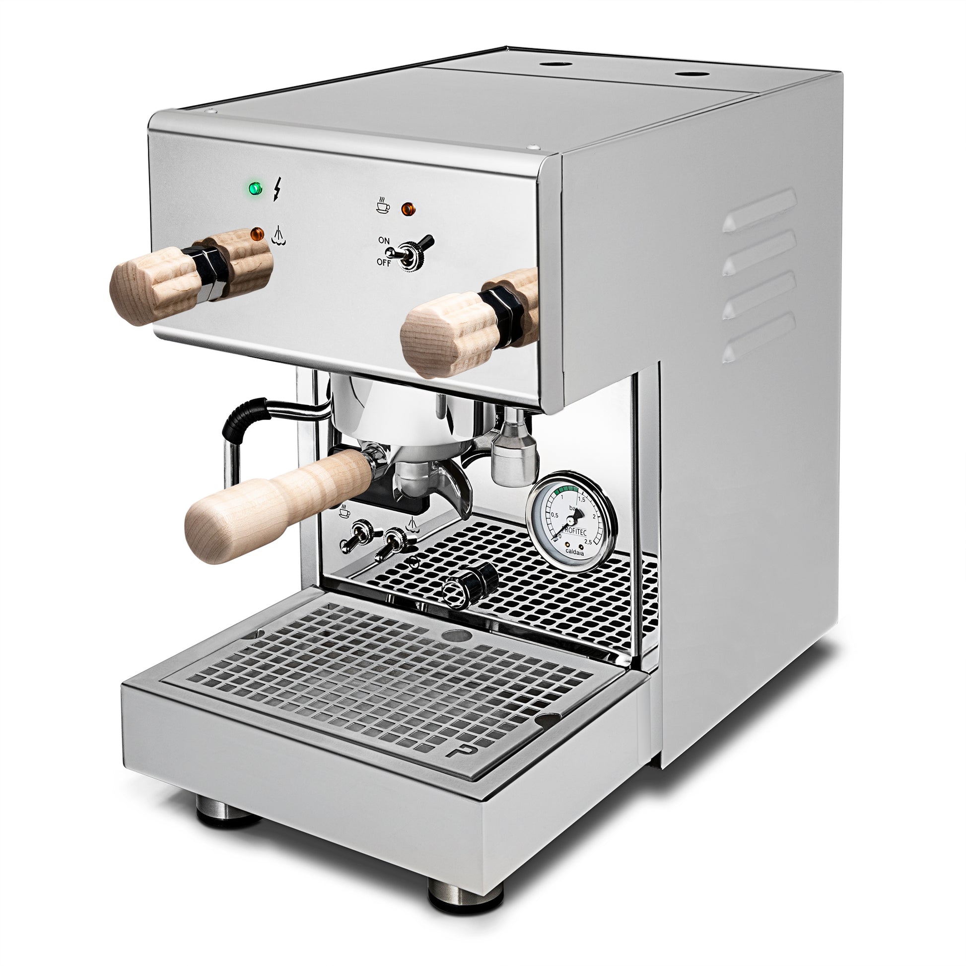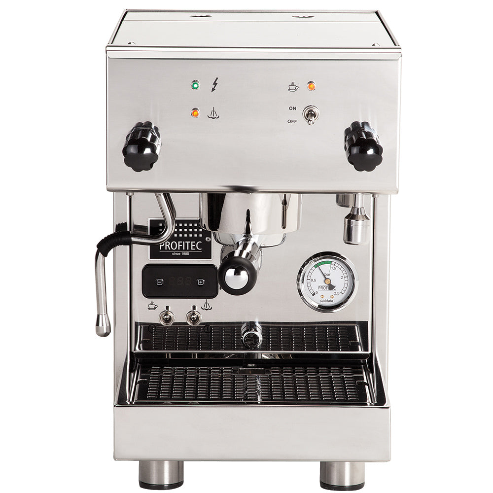 Profitec knows how to impress us. At first sight, the Pro 300 makes a lasting impression with its polished stainless steel exterior. The front panel of the machine sports a steam pressure gauge and Gicar PID controller, which lets us monitor steam pressure and temperature at a glance. The PID reigns in temperature stability to within a degree of the set temperature, and features a convenient shot timer for more precise pulls. The Fast Heat Up means the Pro 300 reaches stable brew temperatures as quickly as possible.