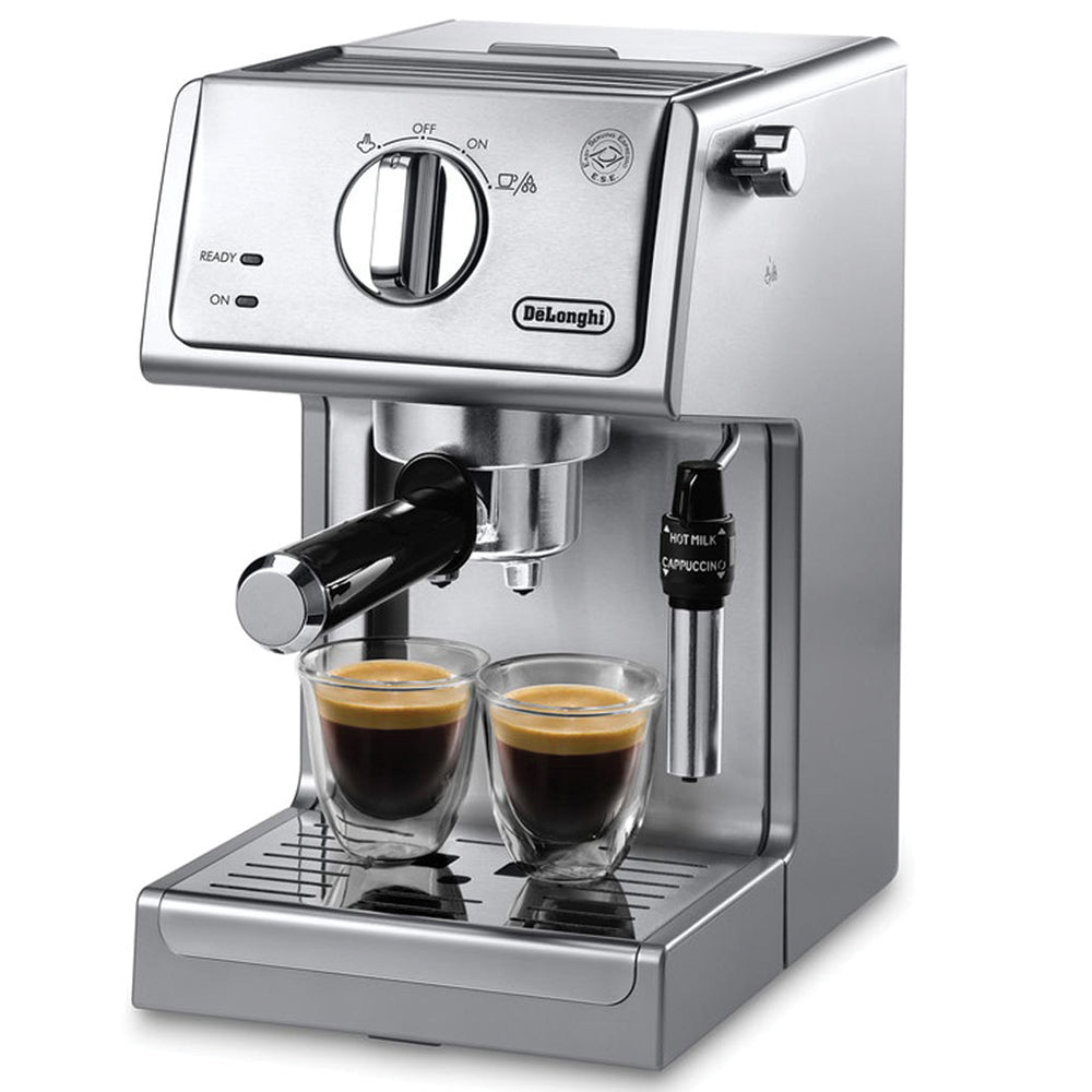 The DeLonghi ECP 3630 Pump Espresso Machine is designed for new baristas. The DeLonghi ECP 3630 is a semi-automatic espresso machine features a pressurized portafilter and easy to use steam wand that makes brewing delicious espresso drinks easier than ever before. The ECP 3630 brews using a 15 bar pump and a 1100 watt stainless steel boiler. To simplify the espresso brewing process, the machine uses a pressurized portafilter and includes three different filter baskets for single shot, double shot, and E.S.E. pod espresso brewing. The pressurized portafilter creates artificial pressure that assists with extraction even if the coffee isn't perfectly tamped or ground to produce a rich crema.