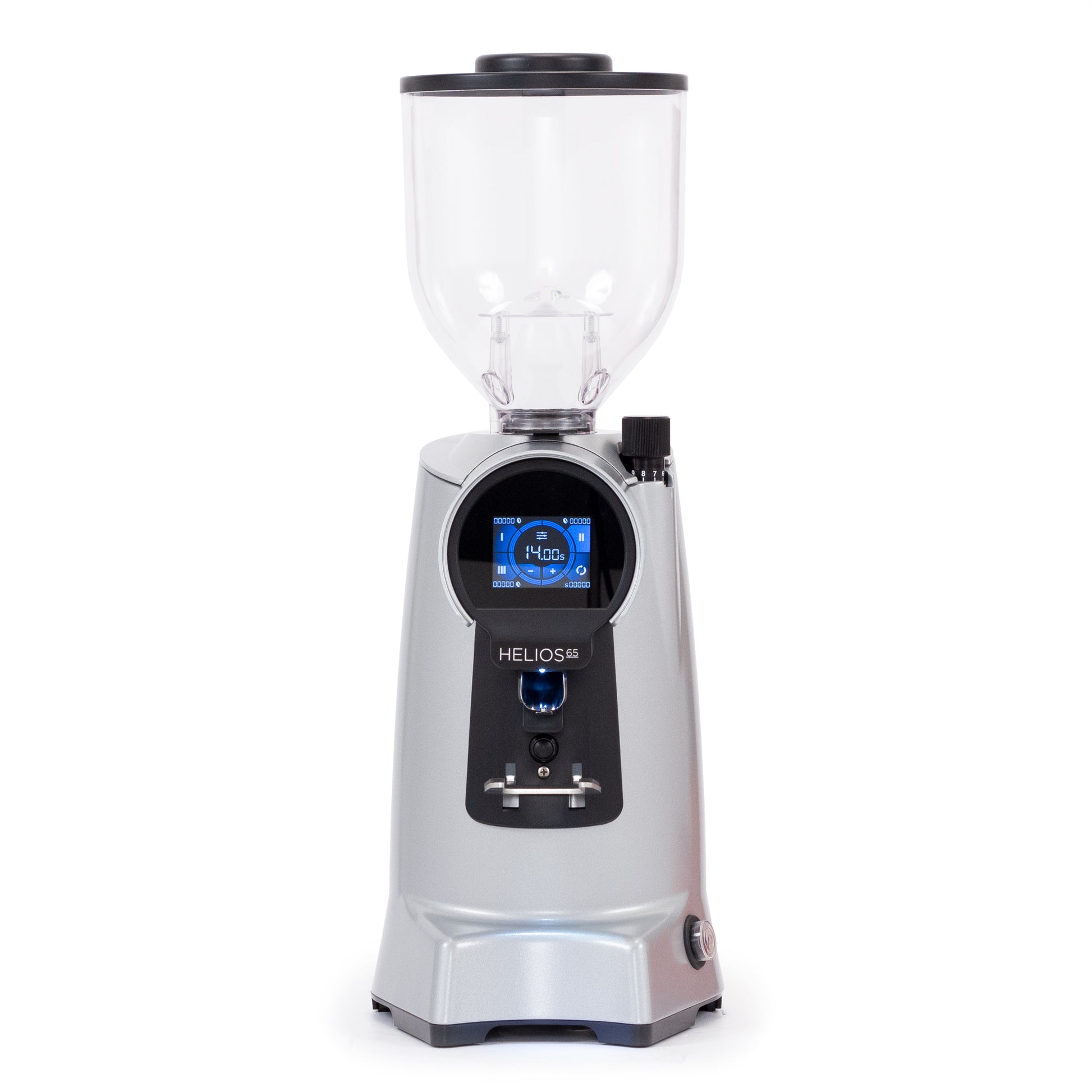 The Eureka Helios 65 is a high speed espresso grinder with intuitive touchscreen controls, 65mm flat burrs, and stepless micrometric grind adjustment. The touchscreen display stores 3 timed-grinding presets, a manual grinding option, and more.