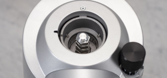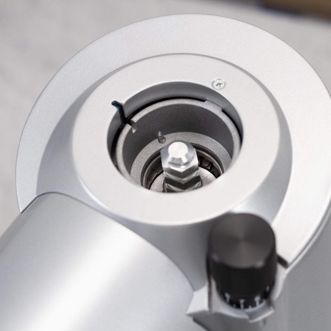 On the Helios 65, the lid is held in place with just a few screws, making it easy to release the lid and remove the top burr for maintenance. Because the bottom burr is adjusted, that means you can access your grinding chamber for cleaning without losing your grind setting.