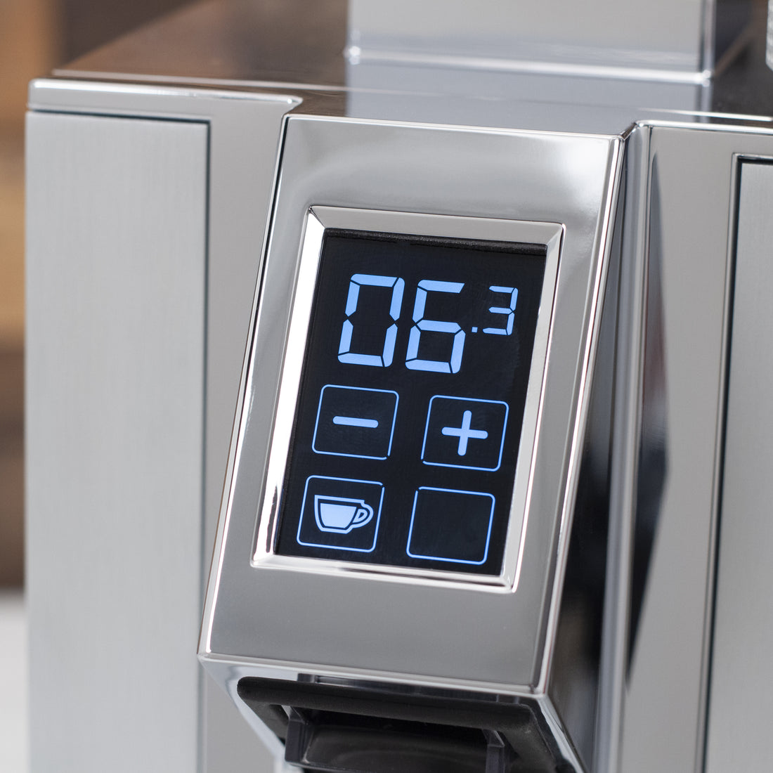 First of all—the touch screen. It's vibrant, with a large font size and clean controls. Grind time is adjustable in tenths of a second using the "+" and "-" buttons, and you can freely switch between single and double shots. Also, you can switch to a manual mode for continuous grinding, or lock in your timed settings to keep other people from fiddling.