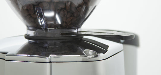 The bean hopper on the Macinatore Fausto is fitted with a locking mechanism to cut off the flow of beans into the grinder. For increased stability, Rocket has included a silicone seal just above the burrs to help secure the hopper in place. Additionally, a small screw located near the base of the hopper can be used to permanently lock it in place.