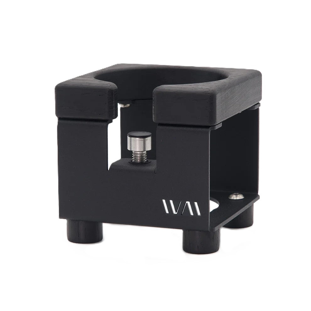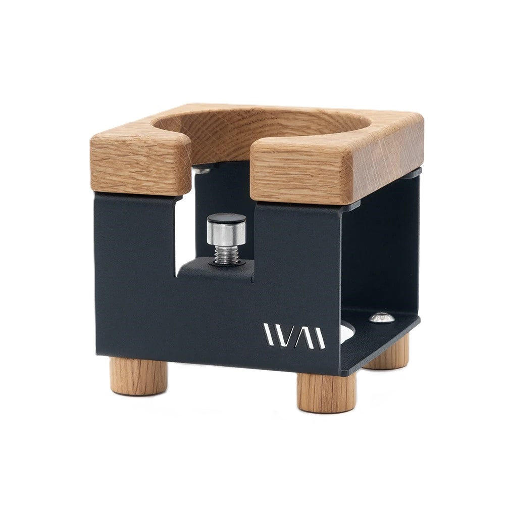 This compact tamping station is nearly a 3.5” cube and features an adjustable screw so you can achieve a perfectly level tamping surface regardless of what style or brand of portafilter you’re using. The metal body is accented with a laser-cut Wiedemann logo and topped by a wooden cradle. On the bottom, the frame has been cut into a clever storage space for your backflush disc which can double as a tray to catch drips from the portafilter. The wooden feet have sticky rubber grips, so you don’t have to worry about messing up a tamp due to slippage.